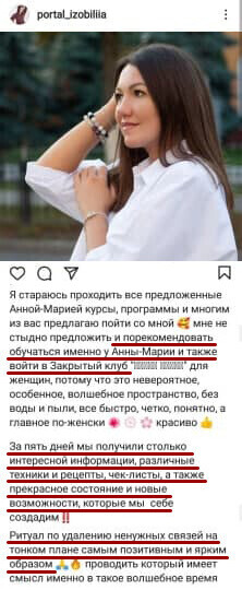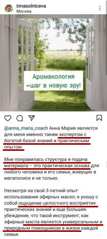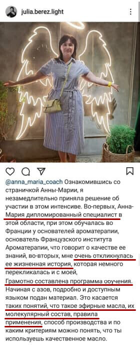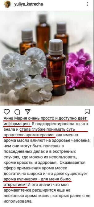 Анна Мария преподает французскую ароматерапию и ольфактотерапию — направления, основанные на научных исследованиях и медицинской практике с доказательной базой. В частности, ароматерапия во Франции относится к комплементарной медицине — дополнение и поддержка традиционной медицины с помощью природных средств. И практикуется в госпиталях и центрах реабилитации, в домах престарелых.